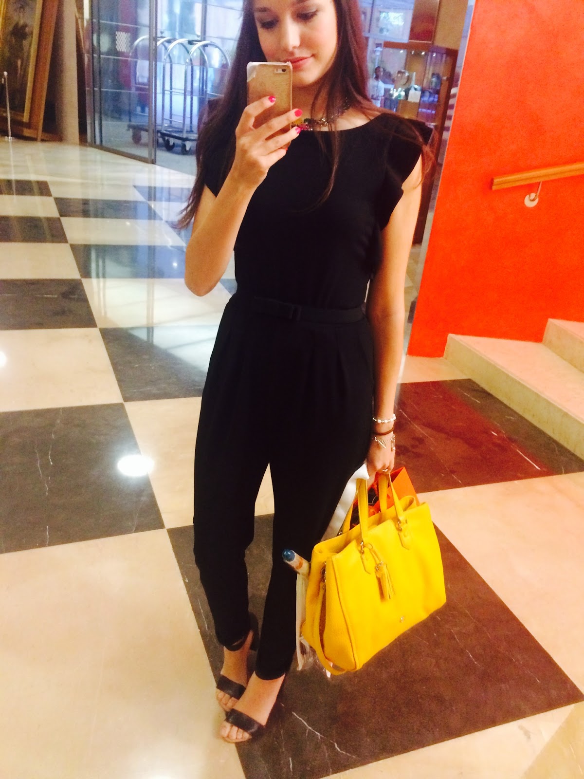 Para el evento elegí este mono negro (nunca falla!) con complementos más veraniegos, como el collar de flores, bolso amarillo y sandalias con tacón